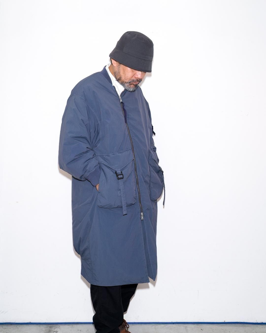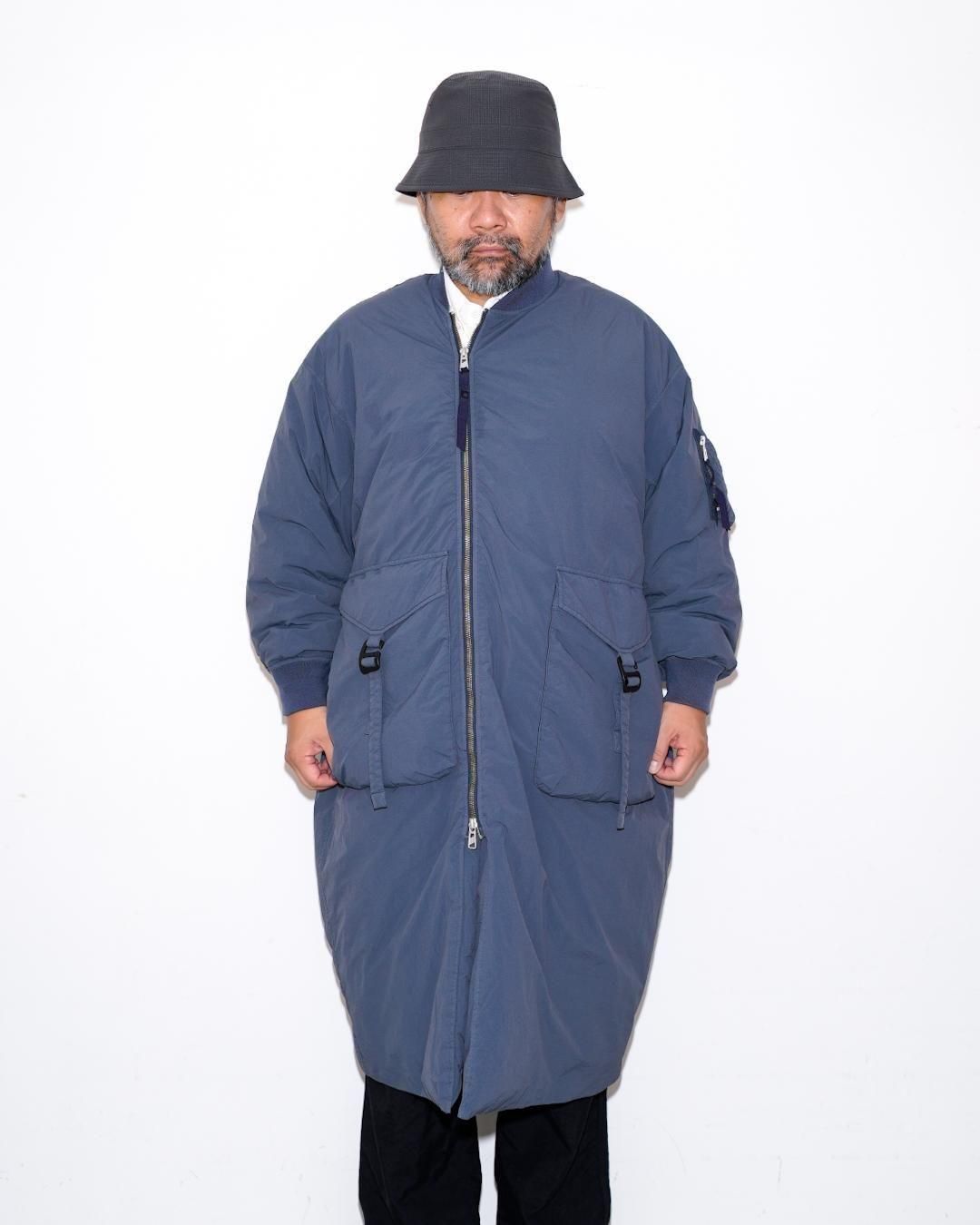 ナイロンの機能性を持ちつつ、製品染を施すことで深みのある独特な色合いの表現が特徴のMA-1タイプのロングコートです